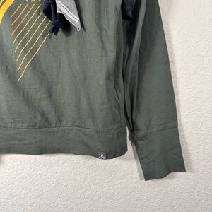 Stylish green sweatshirt with a colorful graphic design. Features Prana branding.