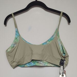 Experience comfort and style with this olive and tie dye reversible swim top. Removable cup liners