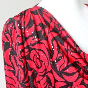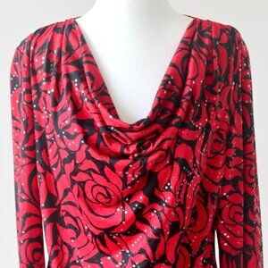 NWT Prelude Red Black Floral Rose Pattern Long Sleeve Cowl Neck Blouse Medium
