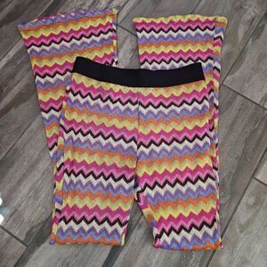 This is a pair of new with tags cover up pants by Pretty Damage. They have a knit chevron pattern in pink, orange, green, purple, and more. These pants have a solid black elastic waistband and are flared at the openings. Note a pull in the fabric as shown in the final photo.