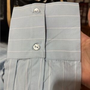 Size US 6 Light blue with white pinstripes Button front with hidden buttons Buttoned cuffs Front pockets This is not very cropped. Probably hits just above waistline. Crisp collar