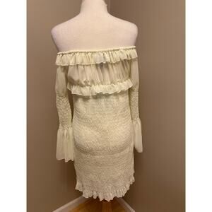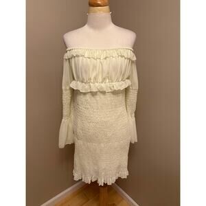 Look fierce in cream with this unreal bodycon dress doll. Featuring a cream chiffon material with shirred detailing and an off the shoulder design, we're obsessed. Just add gold hoops and clear heels for a look that is sure to get you noticed.
