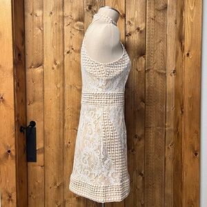 This PrettyLittleThing dress in size 10 is brand new with tags and showcases a stunning white eyelet overlay with a nude lining that creates a soft, elegant contrast.