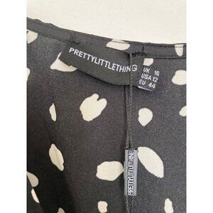 NWT Pretty Little Thing black and white Dalmatian print front wrap playsuit/romper. UK size 16/US size 12. Elastic waist. 100% polyester. Such a fun piece.
