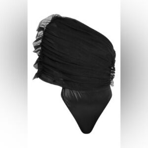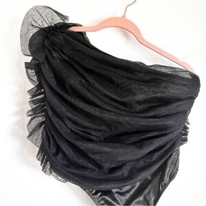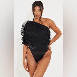 NWT PrettyLittleThing Black Sheer Ruffle One Shoulder Bodysuit. Size 2.