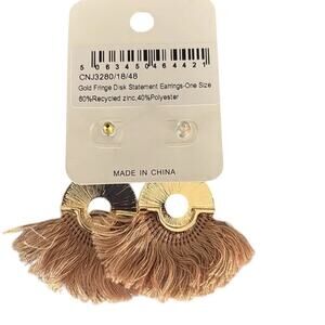 Add a bold touch to your look with these PrettyLittleThing statement earrings. Featuring gold-tone recycled zinc disks with textured concentric circles, paired with soft gold fringe detailing for added drama. Lightweight yet eye-catching, perfect for elevating any outfit from casual to dressy.