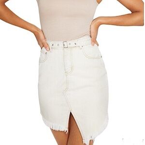 NWT PrettyLittleThing Cut Out Raw Hem Belted Denim Skirt. Size 12. Color: Stone