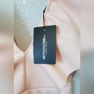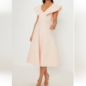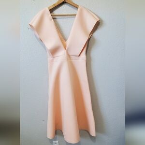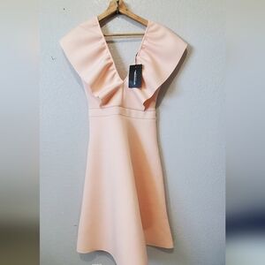 NWT PrettyLittleThing Nude Bonded Scuba Plunge Ruffle Skater Dress Pink Size 14