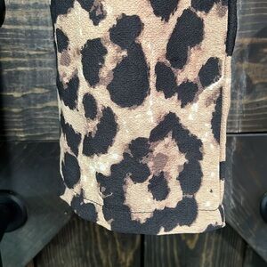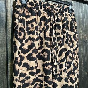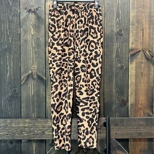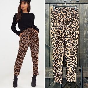 New with tags. Pretty Little Thing brand animal print pants. Size 4. Tie waist. Elastic. Straight leg. Crop length. Super high waist. Leopard. Brown & black. Dress up or down. Flattering & comfortable fit. Front pockets.
