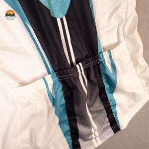 Hit the road in style with this new with tags Primal "No Neck Cycling" jersey. Featuring a vibrant multicolor schematic design in shades of blue, black, white, and grey, this short-sleeved cycling top is both eye-catching and functional. It includes convenient rear pockets for storing essentials during your ride and a comfortable fit designed for performance.