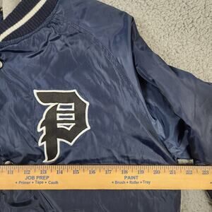 The NWT Primitive Keeper Two-Fer Varsity Jacket in Men's size Medium is a stylish and functional outerwear piece perfect for skateboarding and casual wear. Made with a durable nylon outer shell in a vibrant blue color, this mid-length jacket features intricate embroidered accents and a snap closure. The polyester lining and insulation provide comfort and warmth, making it suitable for cooler weather. With the brand's reputation for quality and style, this jacket is a must-have for any skater or fashion-conscious individual.