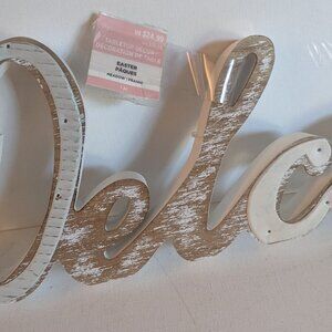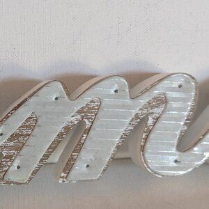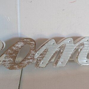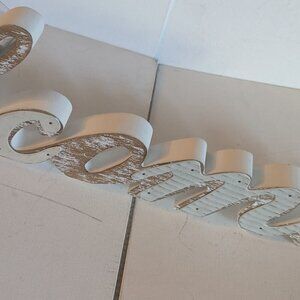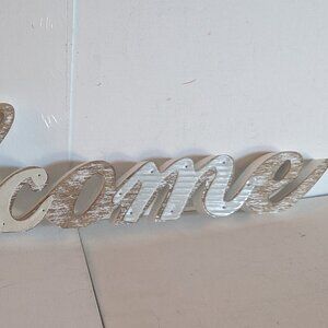 Lovely white and natural wood 'Welcome' cursive or script word sign, by Michael's Ashland 'Meadow' collection. This primitive, farmhouse style table sign features delicately nailed on metal detail, and measures approx 25" in length, 6" tall and 1" deep, and is new with tags. It is meant to sit on a table or other surface. An awesome shabby chic, vintage-style decor item or business greeting sign :)