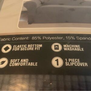Soft & comfortable gray stretch sofa slip cover- 1 piece with elastic bottom for secure fit. Machine washable. New- in package.