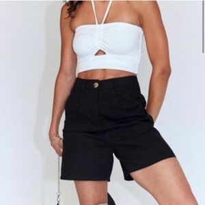 -Black high waisted long shorts, gathered darting front, slant front pockets, button and zip closure, belt loops. Flattering fit