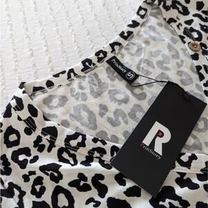 A bit oversized. Cheetah/leopard top, white middle, gray and white stripe bottom, deep V neck. Small mark in white area, but looks like it'd come out with washing.