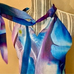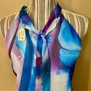This Prism Necktie Dress is truly Unique. Sleeveless with a Keyhole opening at the neck and ties at the collar. Smooth and Lightweight with a white lining. Very flattering!