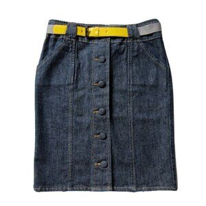 Details: * A trail of fabric covered buttons centers the slim-fitting style of a dark-wash denim skirt woven with curve-hugging stretch. Seamed panel construction. Front slant pockets. Welt back pockets. Contrast topstitching. Belt included. Machine wash. Import. *