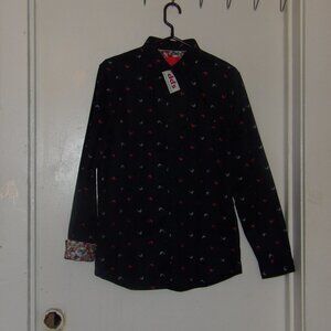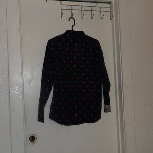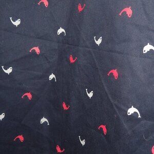 long sleeves with one wrist and one button cuffs , navy or black ( due to cataracts I cant differentiate sorry )with whale pattern and light floral lining and cuffs , size L measurements are roughly 28" from shoulder to hem and about 21" pit to pit with a sleeve length of 26" and a neck size of 18. 100% Cotton, Condition is new with the tags and never worn or washed no issues noted, pet friendly non smoking home.