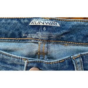 The product is a pair of NWT Project Runway distressed blue jeans with pearl accents, designed for women in size 6. The jeans feature a straight style with a waist size of 30 inches. The distressed detailing adds a unique and stylish touch to the classic blue color, making them a fashionable choice for women looking for a trendy and comfortable addition to their wardrobe.