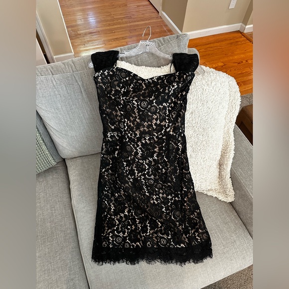 NWT beautiful, lined black lace off-the-shoulder mini dress. Features intricate lace pattern. Sweetheart neckline with grippy line across top of chest to help hold in place. Size small. So cute, it just never fit me after I had a baby!