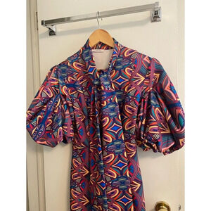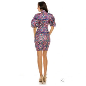 This Pucci style Darling Dear Puff Sleeve Front Tie Dress is exquisite! In colors of purple, pink, yellow, gold and blue mixed to perfection in a very Pucci-esque way! The dress zips entirely up the front in this above the knee fitted dress. With cute puff sleeves and a romantic front adjustable tie. The fabric is beautiful of a rich and thick quality. Perfect for spring as the flowers start to bloom.