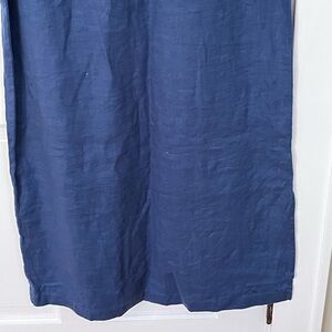 Gorgeous dark blue relaxed linen dress with a gauzy cotton layer above waist that has a split back