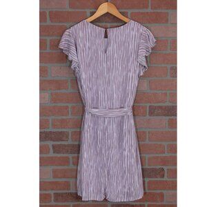 Gorgeous lavender striped flutter sleeve dress with hints of gold thread. This dress is beautiful, a classic, and would be perfect for a wedding guest! Flutter sleeves, self-tie matching fabric belt, and a fully lined interior. Brand new with tags and in perfect condition!