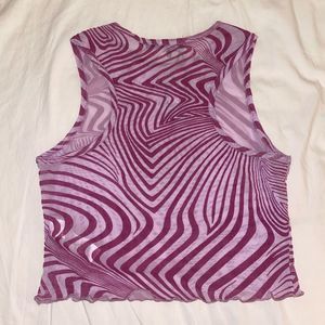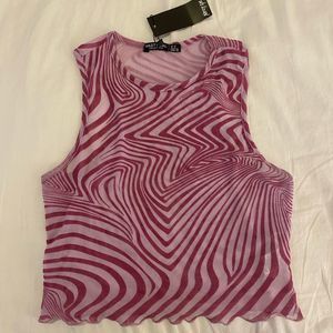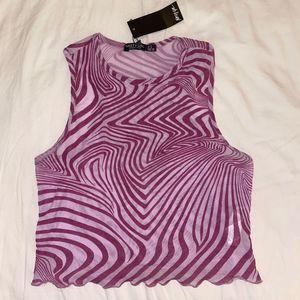 A moment in marble. This groovy cropped top comes in breathable mesh and features a flocked marble print throughout, high neckline, racerback design, and lettuce hem. The perfect piece to wear for twilight escapades with the matching bodycon skirt.