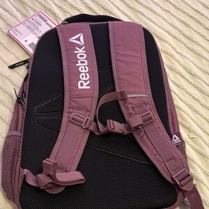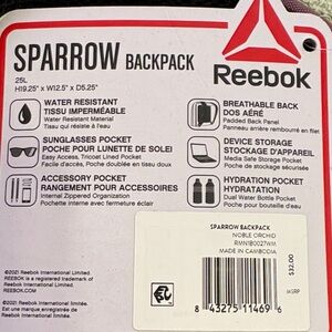 NWT Reebok purple Sparrow backpack. Measurements are 14” wide x 20” tall. See photo for features.
