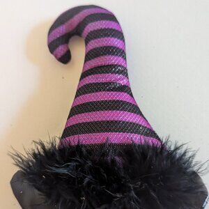 Eerie NWT mini purple curved shape witch hat floral pick by Michael's Ashland Halloween collection, with a flat, faux leather brim with black feathers and iridescent glitter striped fabric. This Dr Seuss-esque, whimsical mini hat floral accessory measures approx 6" tall, 16" total with metal pick, and is in perfect new with tags condition. Awesome for making Halloween themed wreaths, or other fun Halloween home decor. A spooky Samhain, Dia de los Muertos and goth Halloween decoration!