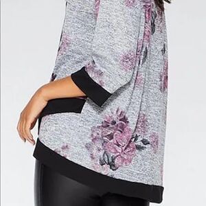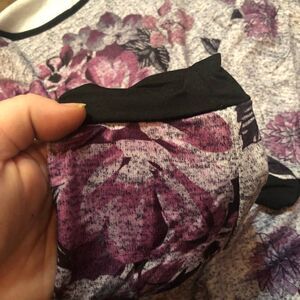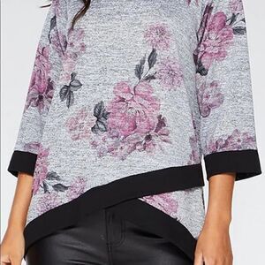 NWT Purple floral asymmetrical three-quarter sleeve top . With black trim - Vintage casual. Cotton blend.