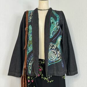 Features a dark denim outer shell with stunning teal, turquoise, and navy abstract appliqué and embroidery. Open front design with no closures, perfect for layering.. Unique artistic patchwork gives this piece a boho, artsy vibe – great for eclectic wardrobes or festival fits, Fairycore fairy Art to wear