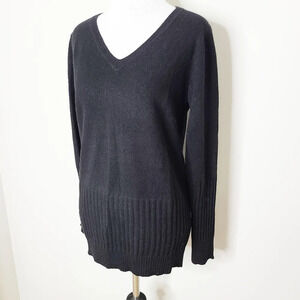 New with Tags Qi black Cashmere v-neck sweater with fray stripe detail down back. Split back detail.