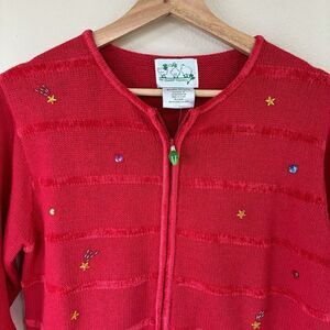 NWT Quacker Factory Red Ramie Christmas Cardigan Velvet Sweater Reindeer Small