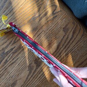 Zippered bag. Quilted white, red, and black ladybug fabric exterior. Red and white polka dot interior and contrast.