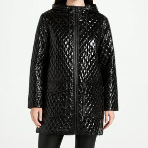NWT Quilted Patent Leather Rain Coat Jacket With Pockets, Women's Rain Puffer, Women's Black Raincoats, Quilted Fall Winter Coats, Fall Leather Rain Jackets, Patent Leather Trench Coat
