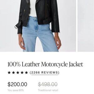 Brand new 100% Leather Motorcycle Jacket from Quince in perfect condition. Color is Black/Brass Hardware which is sold out. Originally $200. Size xs. Pit to pit is 17" with the jacket closed. Shoulder to hem is 22". It says to size up if between sizes on the website. Some reviews get a size up and some get their usual size. If you are not in between sizes, I recommend it for a slim fit. It looks great that way. Read reviews to help decide whether to get this size. Never worn. Only tried on. Very soft leather.