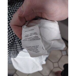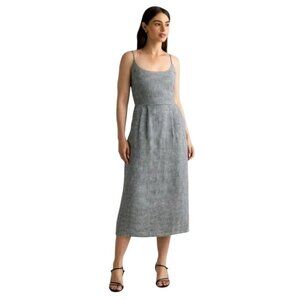The product is a NWT Quince European Linen Scoop Neck Midi Black Gingham Dress in size L. This cottagecore-inspired dress features a sleeveless design with a scoop neck, perfect for a stylish and comfortable look. Made of linen, the black gingham pattern adds a touch of sophistication to the midi-length dress, making it a versatile and chic addition to any woman's wardrobe.