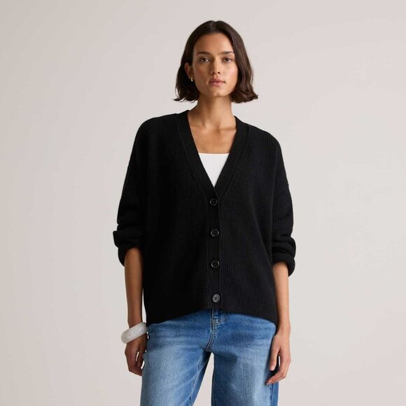 New with tags! The Quince Mongolian Cashmere Fisherman Boxy Cropped Cardigan Sweater is crafted from Grade-A Mongolian cashmere -- so luxuriously soft, thick, and cozy, with classic fisherman rib detailing. Oversized fit with a V-neckline and four-button closure. Black, size XL.