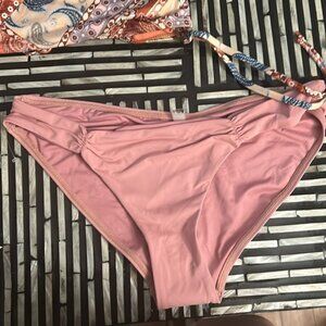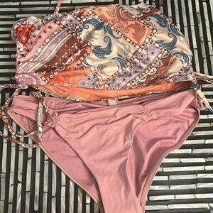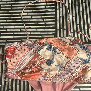 1 New with tags and 1 new without tags bikini set from Quint Soul. Patterned top with solid bottoms. Full coverage but may be cheeky on some people bottoms. Halter top with ruched tied sides.