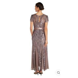 New with Tags R & M Richards New York Mocha Maxi Dress with Embellishment and Satin Waist Tie. Size 10P The ultimate evening gown, prom, or wedding dress, complete with sparkling embellishments and a cinched waist. A round neckline and short, t-shirt style sleeves provide ample coverage, with a peek of skin through a keyhole cutout at the upper back. The dress hugs the curves of the waist before falling into a fishtail-style skin with pleats which provide movement and subtle volume. The entire dress is embellished with sequins, in on intricate pattern. has inner slip with Chest Padding. this is a great quality Dress Be ready to sparkle and turn heads