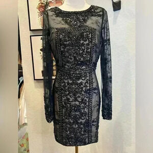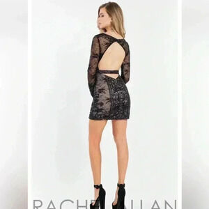 This beautiful black mini dress by Rachel Allan is the perfect addition to any wardrobe. The beaded accents, sheer long sleeve arm with zipper, and open back add a touch of glamour to the style, making it perfect for both formal and casual occasions. The dress is a size 4 and has never been worn, with tags still attached.