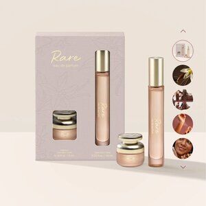 Perfect for on the go, this set includes a travel spray and a mini replica bottle featuring a rollerball format.