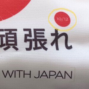 Interior flap has a "Gan Ba Re 頑張れ -- Persevere" graphic and a red "10/12" label indicating the bag number
