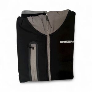 Stylish Rawgear hoodie in black and gray. Features a sleek design with a front zipper.