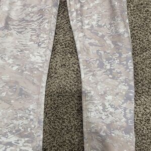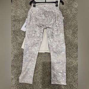 Brand new with tags! This beautiful cream color tank and patterned legging set is a great combo! The pattern of the leggings is similar to a camo print, and the colors are light brown cream and a grayish blue. The leggings have pockets on both sides and a high waist. The tank is a racerback style with a ribbed pattern on the upper portion of the back of the shirt.