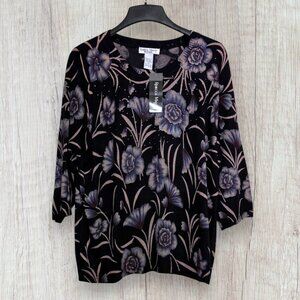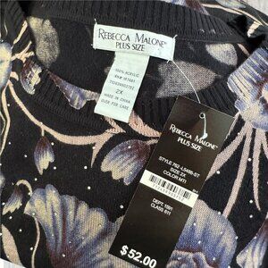 NWT REBECCA MALONE Black Blue Floral Rhinestone Lightweight Tunic Sweater 2X