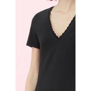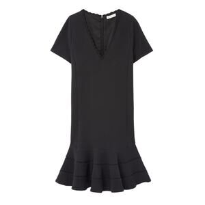 Scalloped trim at the V-neckline and a flared ruffle hem add detail to this all-occasion dress. Its classic short-sleeve silhouette is ideal for the office or dressed up for evening events.