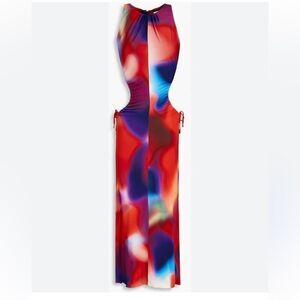 Sexy tie waist cutouts elevate this psychedelic dress by Rebecca Vallance.