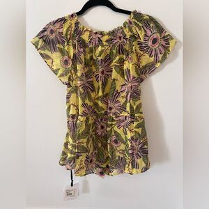 This brand new with tags REDValentino blouse brings bold florals and feminine charm to your wardrobe. Featuring a vibrant botanical print in pink, green, and purple on a soft yellow base, this lightweight blouse has a flattering smocked neckline and button-down front. Crafted in Italy and originally retailed at $450, this is a beautiful designer piece perfect for spring and summer styling.